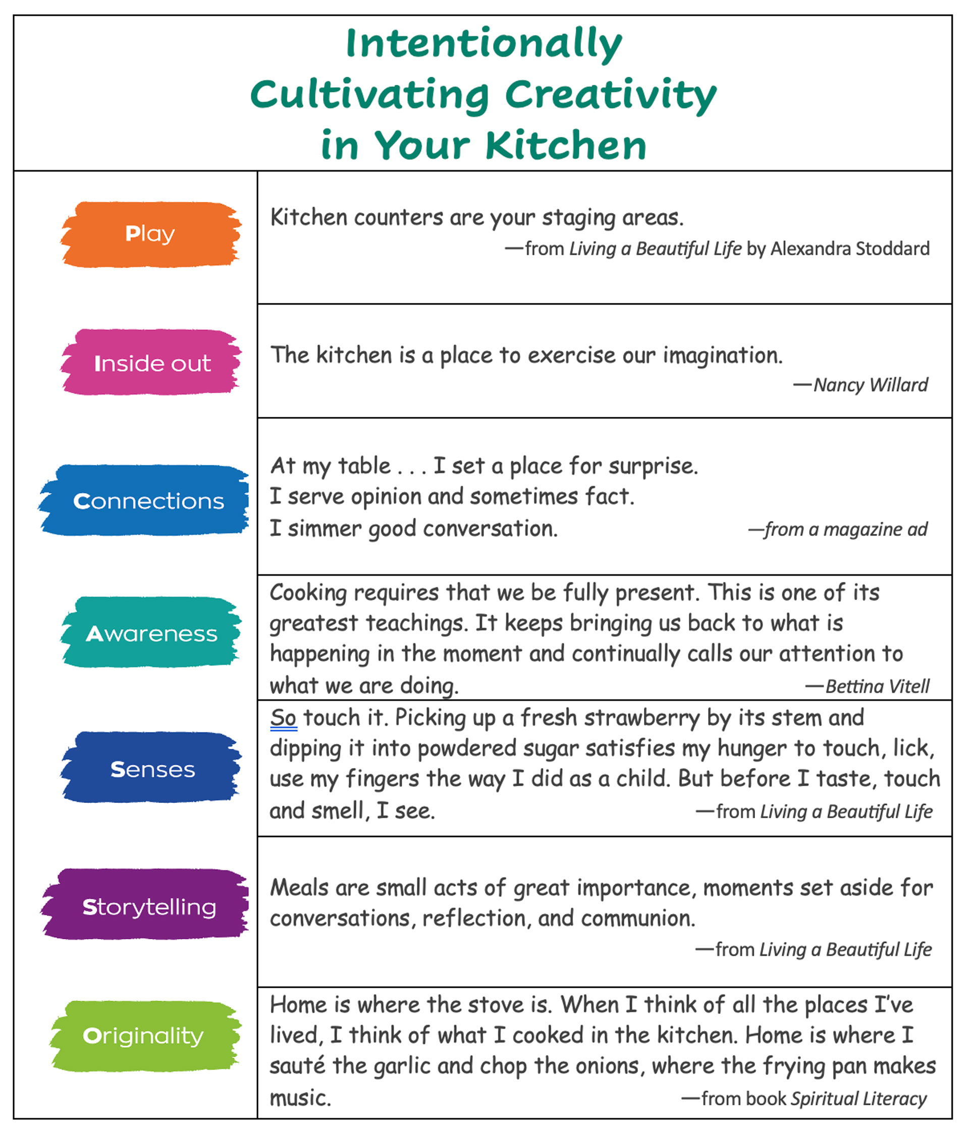 First, I went to my stash of quotes about the kitchen which I have collected for years. I read them again. I was compelled to take out my worksheet on the seven practices for cultivating creativity from my book. I began weaving together ideas of how to impart to the soon-to-be newlyweds a vision of using the space and place of the kitchen to intentionally cultivate creativity. I ended up selecting one quote for each of the PICASSO-7 practices. This was not easy as there were several quotes that mapped to each practice, and I had to choose just one for the sake of space. That is for all but one. I discovered there were very few quotes about play. I’ll say more about that later. Once I decided on the best ones for them, I printed them on beautiful paper and used a colorful fashion clipboard to present them in lieu of a frame. The quotes matched to the seven practices are shown below.